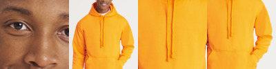 80% ringspun cotton/20% polyester.* Soft cotton faced fabric. Brushed back fleece. Drop shoulder style. Double fabric hood. No drawcords to comply with EU regulations. Front pouch pocket. Ribbed cuffs and hem. Twin needle stitching. Tear out label.