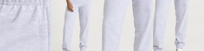 Heather grey 75% ringspun cotton/25% polyester. Soft cotton faced fabric. Brushed back fleece. 1x1 ribbed waistband. No drawcords to comply with EU regulations. Two side pockets. Cuffed leg ends. Tear out label.