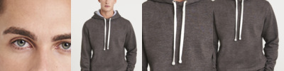 Charcoal 52% ringspun cotton/48% polyester. Soft cotton faced fabric. Brushed back fleece. Contrast raglan sleeves. Contrast double fabric hood with flat lace drawcord. Front pouch pocket. Ribbed cuffs and hem. Twin needle stitching. Tear out label.