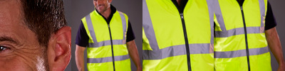 100% recycled polyester (some colours in transition). Conforms to EN ISO 20471: 2013 + A1: 2016 class 3. Tear release front closure. Two reflective bands around the body, sleeves and one over each shoulder.