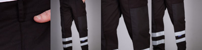 65% polyester/35% cotton. Conforms to EN388: 2003. Nylon ballistic material on outside leg from thigh to ankle. Part elasticated waistband with belt loops. Zip fly with concealed hook and bar over. Two side pockets. Rear jetted pocket. Sewn-in front crease. Two reflective bands around lower legs. Branded woven tab on lower left leg.