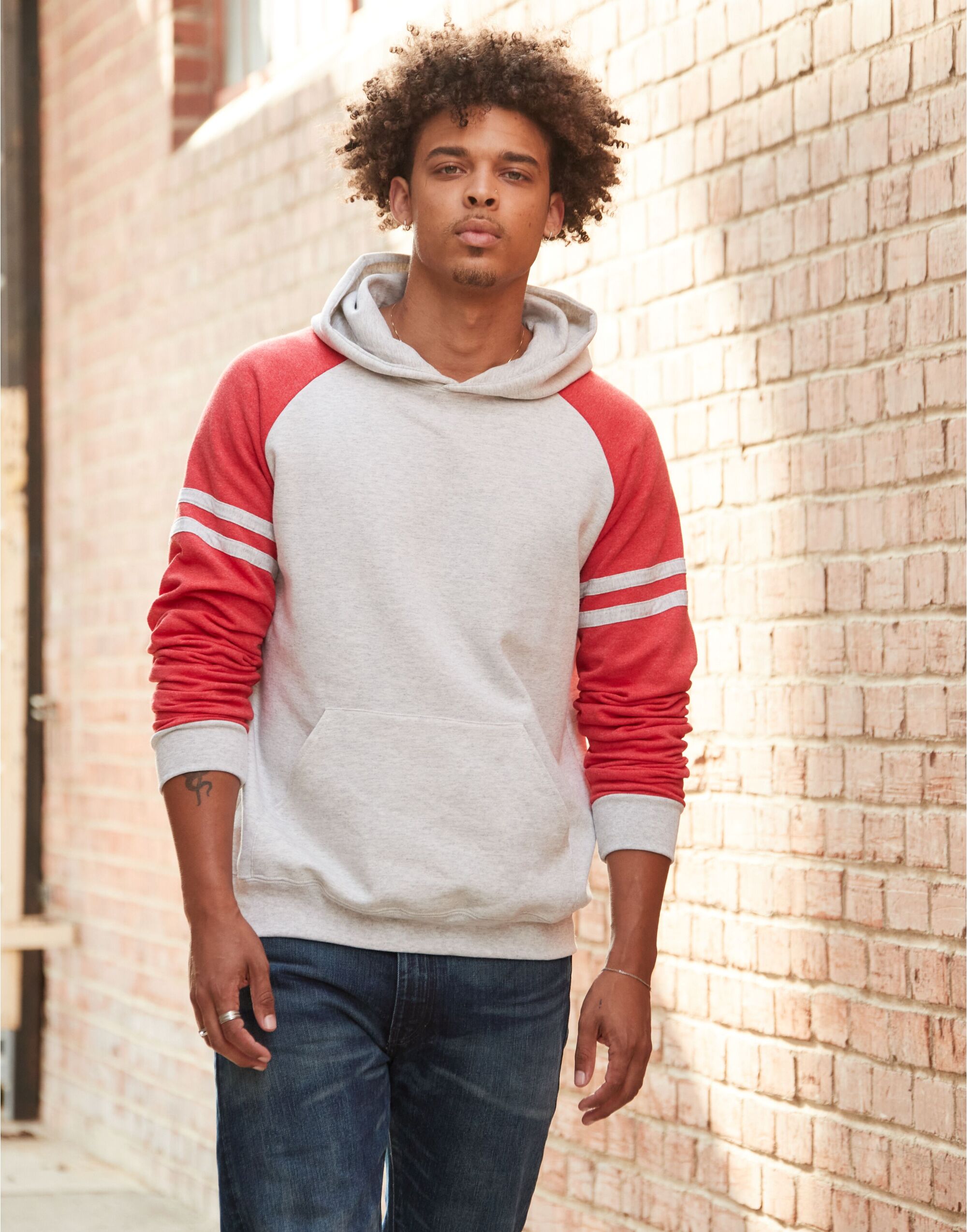 NuBlend® pill-resistant 2-end fleece Made with sustainably-sourced, USA-grown cotton High stitch density for a smooth printing canvas Color-block styling provides a fresh approach to an athletic style Raglan sleeves for ease of movement 2-ply lined hood with grommets Single-needle topstitch on front neck Contrast hood lining, neck tape trim, flat woven drawcord and sleeves Front pouch pocket Two-needle cover stitching on armholes and waistband 1x1 rib cuffs and waistband