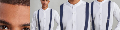 Y back trouser braces with stretchy elastic fabric for comfort and style. 3cm strap width. Two metal non slip clips to the front for attachment to trousers. One clip to the back. Metal lock buckles for adjustment making a one-size-fits-all piece.