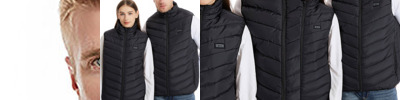 Heated padded gilet with five fast heating zones and three heat settings. Independent front and back heating zones. Soft and comfy. Includes pocket to store power bank. Connects to most power banks via USB-A (power bank not included).