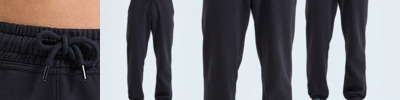Soft-feel joggers. Unisex style. Relaxed loose fit. Inner brushed fleece. Recycled polyester. Elasticated waistband and cuffs. Buttonhole stitched eyelets. Cords with painted metal ends.