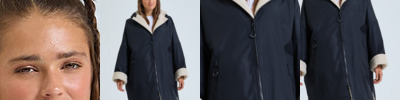 Unisex. Oversized. Full-length two-way plastic zip with easy pull toggles. Chin guard. Oversized fit. Side vents. Adjustable cuffs with hook and loop fastening. Side zip pockets. Inside pocket with zip on the left side. Inside patch pocket on the right side. 3-panelled hood. Loop on the centre back of the jacket for hanging the robe. Dropped back hemline. (5000/5000 waterproof and windproof). Embroidery access to the back and chest area can be accessed through here. Waterproof taped seamed outer layer. Sherpa fleece interior. Rebrandable stuff sack carry bag with double drawstring straps. CE Class 1 Certified.