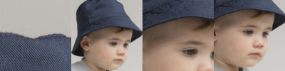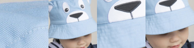 Kids bucket hat with embroidered character facial features. Two colourways in different animal styles. Top-stitched brim detail. Flat top. Elasticated back. Suitable for decoration.