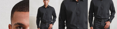 Men’s poplin shirt made with certified recycled polyester and cotton. Stiffened formal collar with top button. Full button-through with pearlised buttons on white and self-coloured on black. Two-button adjustable cuff with cufflink hole. Sleeve guard with single button. Curved hemline. Back darts and yoke for overall fit and shape. Easycare fabric.
