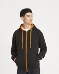 Standard fit with brushed inner fleece, Full zip hoodie, Contrast plastic YKK zip, Double fabric hood with contrast inner, Contrast flat lace drawcords, Kangaroom pouch pockets, Ribbed cuffs and hem, 100% cotton faced fabric, Tearaway label, *Charcoal: 52% ringspun cotton, 48% polyester, *Heather Grey: 75% ringspun cotton, 25% polyester