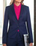 63% Polyester (30% Recycled), 34% Viscose, 3% LYCRA® Elastane. Tailored fit, 1 button, notch lapel, centre vent, twin outer welt pockets Centre back length at size 12R = 63cm