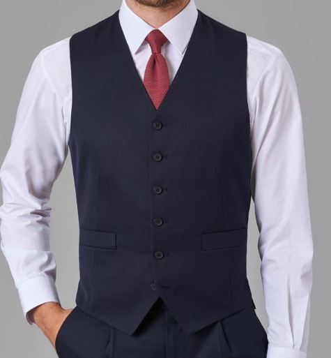 64% Polyester, 34% Viscose, 2% Lycra. Tailored fit, 5 button front, 2 welt pockets, part lining back with adjuster. Centre back length at size M = 62cm