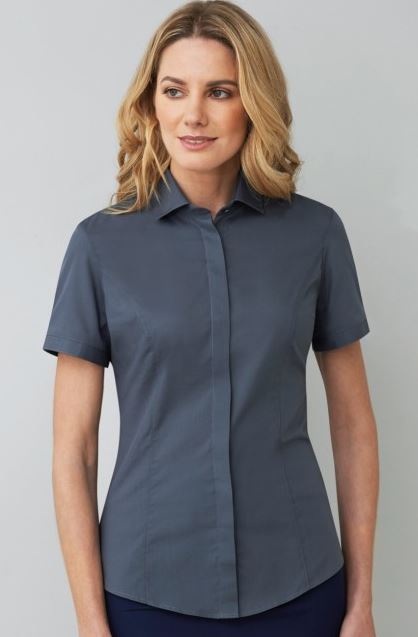60% Cotton / 40% Polyester. Cotton rich, semi-fitted, short sleeve ladies blouse, Fly front, Button up collar, cutaway collar Matches Lugano blouse & Monza shirt.