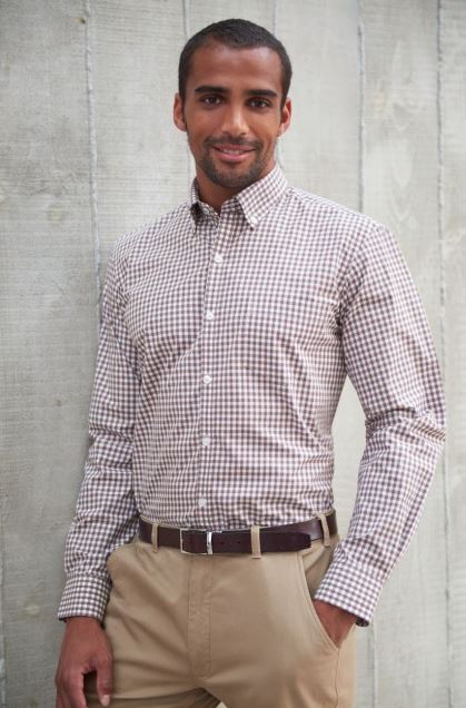 60% Cotton, 40% Polyester. Easy-to-iron slim fit shirt, Effortlessly stylish, twin rear darts for a defined silhouette, Semi cutaway collar, Long sleeve, Houndstooth pattern. Matches ladies Lugano & Napoli