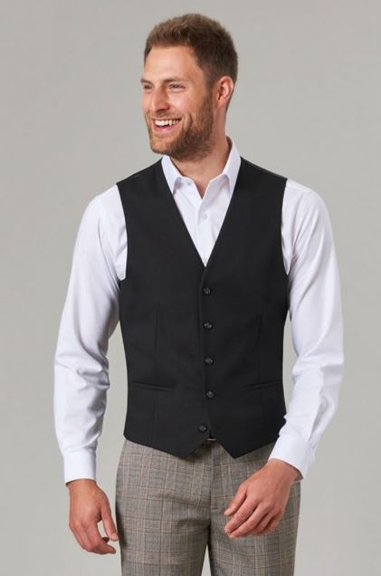 64% Polyester, 34% Viscose, 2% Lycra. Tailored fit, 5 button front, 2 welt pockets, part lining back with adjuster. Centre back length at size MED = 51.5cm