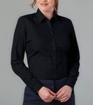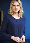 94% Polyester, 6% Elastane. Long sleeve ladies' blouse, round neck, front pleat detail, bust darts, single gold button cuff, rear gold zip detail, easy care - machine washable at 30 degrees