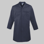 Crease resist finish. Concealed front stud fastening. Centre back vent. Length 100cm. Two front patch pockets and one left breast pocket. Industrial laundry 85?.