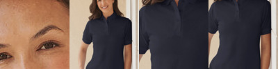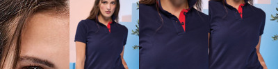Fitted polo for women with contrast collar and placket. Two contrast coloured buttons on placket. Contrast colour on side vents. Twin needle stitching on hem. Ribbed knit collar and sleeve cuffs.Washing InstructionsDomestic wash at 30c