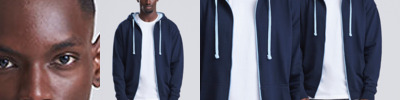 Full zip hoodie with contrast zip. Twin needle stitching detailing. Double fabric hood with contrast inner.Contrast flat lace drawcords. Kangaroo pouch pocket. Right hand side pocket has small hidden opening for earphone cord feed. Hidden ear phone loops. Ribbed cuff and hem. Worldwide Responsible Accredited Production (WRAP) certified production.
