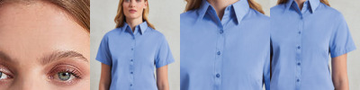Soft collar styling. Rounded bottom hem. Fitted styling with bust darts and back darts. Easycare fabric, short sleeves. Pearlised buttons on light blue and white. Self colour buttons on remaining. Size 6, 8, 10, 12, 14, 16, 18, 20, 22, 24, 26 * size 6 only available in these colours