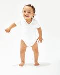 Wrap-over style, kimono bodysuit with nickel-free pop fasteners at side for ease of dressing, Nickel-free snap poppers at leg opening, Binding around neck, sleeve ends and leg openings for shape retention, Short, raglan sleeves, Tear away label, Made from Oeko-Tex Standard 100, Organic Content certified to the OCS, Made in Africa, GOTS certified, *Height: 53/60cm 60/66cm 66/76cm