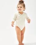 Wrap over, kimono style bodysuit with long raglan sleeves, Nickle free pop fasteners at side for ease of dressing and snap poppers at leg openings, Binding around neck, sleeve ends and leg openings for shape retention with tear off label, Care label with QR code to follow supply chain and check positive impact of buying organic, Care label made from organic cotton, Made in Africa, Organic Content certified to the OCS, Made from Oeko-Tex Standard 100, GOTS certified, *Height: 53/60cm 60/66cm 66/76cm