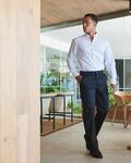 Stretch twill fabric, Slim fit with flat front, Dyed to match buttons, Slanted side pockets, Two single jet back pockets, Back darts for added fit, YKK front zipper and belt loops
