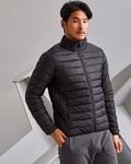 Stand up collar, Diamond shape quilting, Filled with artificial down, Self coloured zip through centre, Elasticated arms and hem, Welted pockets, Machine washable at 30 degrees, Tear out label, Showerproof, Embroidery access