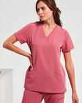 Breathable four way stretch for easy movement and all day comfort, Durable, crease resistant and easy care, Made with recycled polyester, Modern fit with back darts and side vents, V neck style with two front pockets
