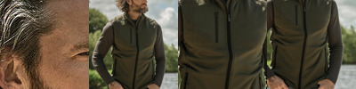 Standard fit, Full front zip, Printable two layer bonded softshell gilet, Zipped pockets, Chin guard, Internal storm flap, Adjustable shockcord hem, Windproof and showerproof