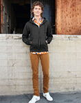 85% organic combed cotton/15% recycled polyester. Sherpa lined. French terry inner. Enzyme washed. Drop shoulder style. Straight fit. Two panel sherpa lined hood with self colour drawcord. Recycled metal eyelets and drawcord tips. Overstitching around the hood. Herringbone taped neck. Full length zip. Front pouch pockets. 1 x 1 ribbed cuffs and hem. Twin needle stitching. Tag free. Recycled polyester is made from post-consumer waste.