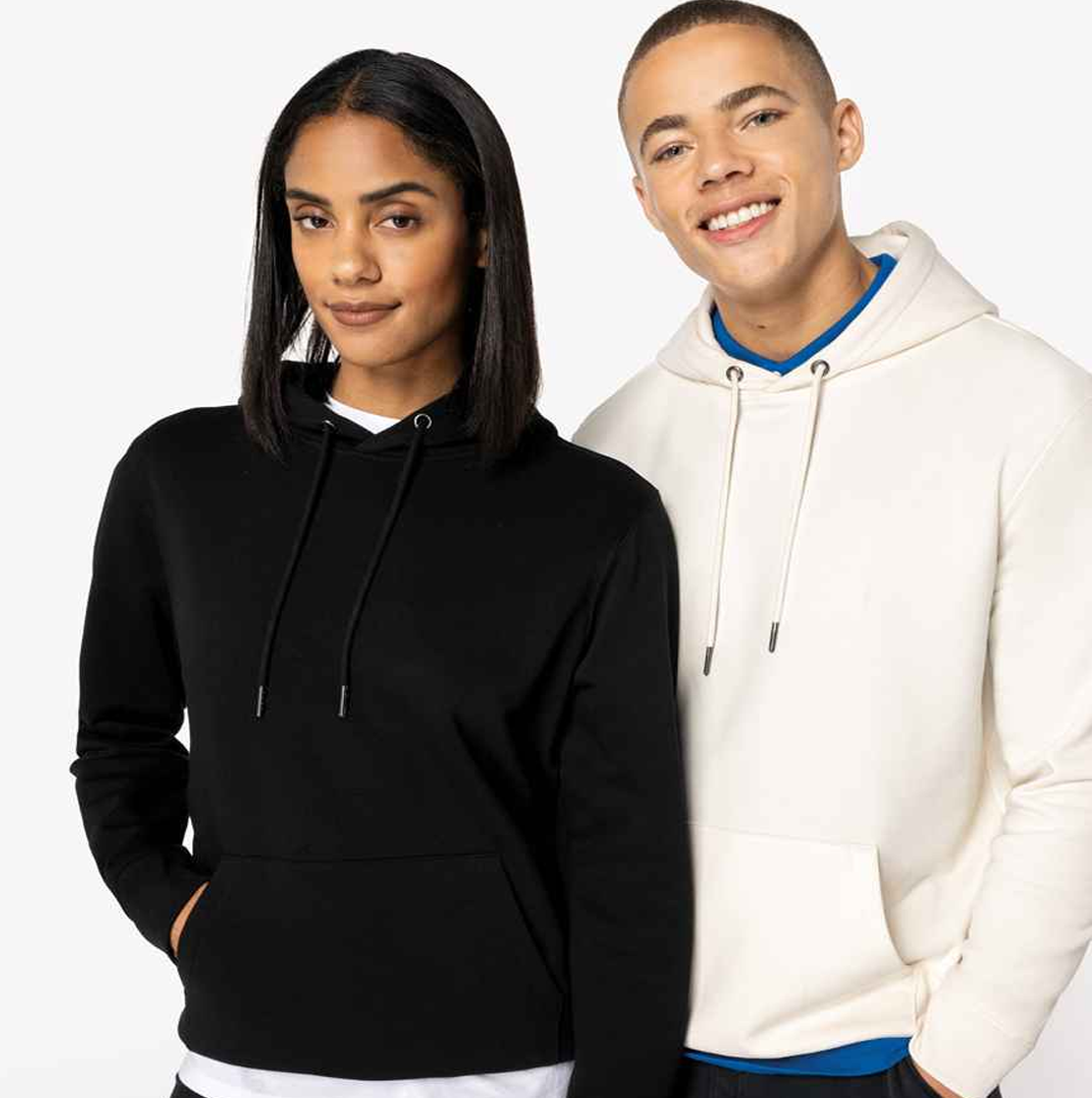 85% organic combed cotton/15% recycled polyester. Brushed back fleece. Drop shoulder style. Straight fit. Lined hood with self colour drawcord. Recycled metal eyelets and drawcord tips. Jersey taped neck. Half moon back yoke. Front pouch pocket. 1x1 ribbed cuffs and hem. Twin needle stitching. Tag free. Recycled polyester is made from post-consumer waste.