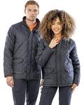 Showerproof, breathable and windproof, Heavy duty zip through collar with chin guard and zip pull, Black elasticised black bound cuff and hem, Soft feel poly wadding, Zipped pockets and inside pockets, Hang loop, Recycled fabric made from recycled plastic bottles and post industrial waste, End of life recyclable