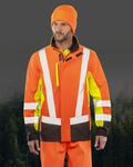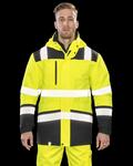 Three layer mechanical yarn fabric with durable water repellent finish, Waterproof to 8000mm, breathable to 3000g and windproof TPU membrane layer, Black colour contrast panels in strong oxford nylon fabric, Reflective print body bands, Zipped pockets, Stand up collar and hangtag, YKK full zip with chinguard, Open cuff, Conforms to EN ISO 20471:2013+A1:2016 Class 2, Orange also conforms to RIS-3279-TOM