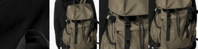 100% recycled 600D polyester. Coated fabric. Grab handle. Back panel and shoulder straps made from mesh fabric. Black buckles. Top flap with adjustable drawcord and stopper closure. Main zip compartment. Front zip pocket. Side pockets with bias binding finish and adjustable straps. Rear zip pocket. Internal zip pockets. Reinforced bottom. Tag free. Capacity 26 litres. Recycled polyester is made from post-consumer waste.