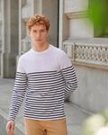 Tag free regular fit, heavyweight long sleeve t-shirt, Crew neck with stretch ribbed neckline, Twin needle stitching at cuffs and hem, V flatlock stitching detail at neck, Flatlock stitching at neck, shoulder, seam and armholes, High chest and upper arm seams, Striped lower body and seams with contrast upper panel