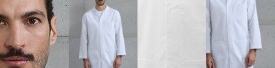 Classic three-pocket workcoat. Unisex styling. Two large lower patch pockets. Left chest patch pocket with pen holder. Lapel collar. Five concealed press stud buttons for fastening. Bar tacking for extra reinforcement. Loop on the inner neck for hanging up. Designed to withstand industrial washing for cleanliness and hygiene. Contains certified recycled polyester.