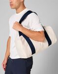 Over-the-head vest apron. Heavyweight, durable canvas fabric. Side fastening with seatbelt-style straps and clip fastening buckle. Left chest pocket with press stud fastening. Two, large tablet-friendly pockets. Finished with a trimmed edge. Two unisex sizes. Contains certified recycled polyester. Available in sizes S/M (70cm long x 36cm wide) and L/XL (78cm long x 38cm wide).