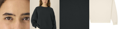 Unisex recycled cotton boxy crew neck sweatshirt. Set-in sleeves. 1x1 rib at sleeve cuffs and hem. Twin-needle topstitching centred on seams at shoulders, armholes, sleeve cuffs and hem. Inside herringbone back neck tape. Self-fabric half-moon at the back neck. Contains 50% GRS-certified recycled cotton and 50% OCS-certified organic cotton, certified by Control Union CB-CUC-1393082.