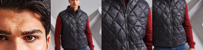 Tonal fashion coil zip on centre front with signature zip puller. Front & Back panels to be insulated with moulded vector shaped pattern. Insulated plain sleeves. 100gsm lightweight polyester fill. Fully-lined in tonal polyester. Bomber style collar. Welt pockets with rubberised stud opening, striped grosgrain trim with rectangular eyelet. Tonal elasticated cuffs and hem. Internal double jet zipped pocket. Internal zipped opening for embroidery access. Product contains no branded neck label.* Removable Kimble or looped garment tags. Inner seam label holds important product information on one label with a second label containing brand information which can be cut-away.