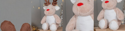 Soft plush reindeer. Contrast eyes and fabric contract nose. Contrast fabric antlers. Cream coloured panel on tummy and inner ears, and feet. Zip access on the base of the reindeer for direct access onto the tummy for embroidery. Removable inner stuffing. Can be embroidered or sublimation printed. Complies with EN71 European Toy Safety regulations. Remove all hang tags and their fasteners before giving these items to a child. Suitable for children of all ages.