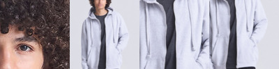 Long sleeve regenerated cotton zoodie with brushed inner and peached outer face. Features include set-in sleeves, contrast rib at cuffs hem, full length front zip and kangaroo pocket.