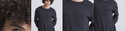 Lightweight sweater made from regenerated cotton. Set-in sleeves with rolled cuffs , hem and collar.