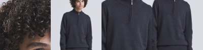 Long sleeve sweater made from regenerated cotton with tall collar and ¼ zip neck. Contrast rib stitches at shoulders cuff and hem.