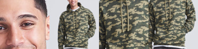 Twin-needle stitching detail. Classic all over camo print. Flat lace drawcords. Double fabric hood. Kangaroo pouch pocket. Ribbed cuffs and hem. Soft cotton faced fabric creates ideal printing surface. Simple tear-out label makes it perfect for rebranding. Flat lace drawcords. Brushed inner fleece.