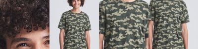 Modern fit short sleeved T. Size tab label. All over camo print. Taped neck. Twin-needle stitching on sleeves and bottom hem. Ribbed crew neck style. Side seams. Set-in sleeves.