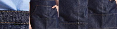 Denim waist apron with contrast stitching. Copper rivets. Four pocket compartments. 106cm self fabric ties. Length of apron is 39.5 cm and width 79cm.