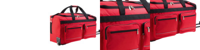 600D polyester. Carry handles with pad. Detachable adjustable shoulder strap. Haul handles at each end. Main zip compartment. Front zip pocket. Baseboard. Studded base. Capacity 93 litres.