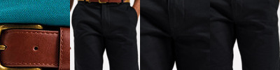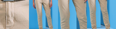 Flat front chino trouser. Tag free. Stretch fabric for ease of movement. Slanted front pockets, 2 back welt pockets, belt loops plain hem.