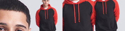 Twin-needle stitching detailing. Contrast raglan sleeves. Double fabric hood. Contrast flat lace drawcord. Kangaroo pouch pocket. Ribbed cuffs and hem. Soft cotton faced fabric creates ideal printing surface. Simple tear out label makes it perfect for rebranding.