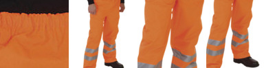 Conforms to EN ISO20471:2013 Class 1, EN343 against foul weather. Orange/Navy also conforms to GO/RT 3279 and approved for railway industry. Navy contrast helps to provide a corporate image whilst disguising dirt around the hem area. 100% waterproof Polyester with Oxford PU coating. Two 5cm wide reflective bands around lower legs. Elasticated waistband. Stitched and taped seams. Snap buttons on the bottom for adjustment. More colours available, code HVS461 & HVS462. Matching jackets, code HVP211 & HVP300.